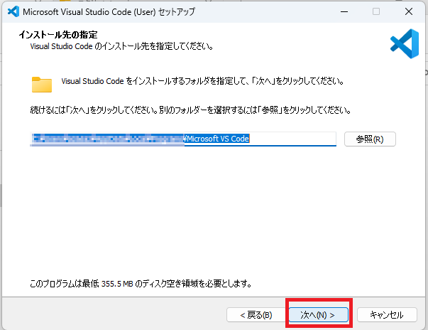 5.インストール先の指定を行います。とくに変更がなければ、そのまま「次へ」で先へ進みます。